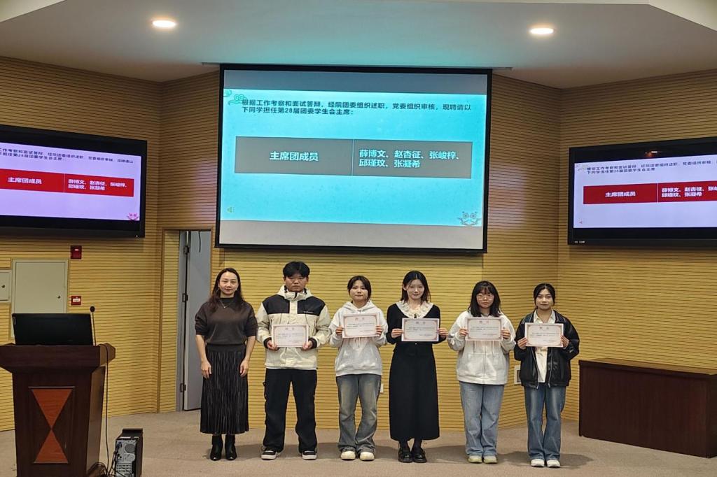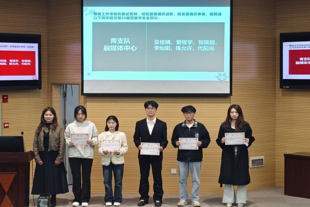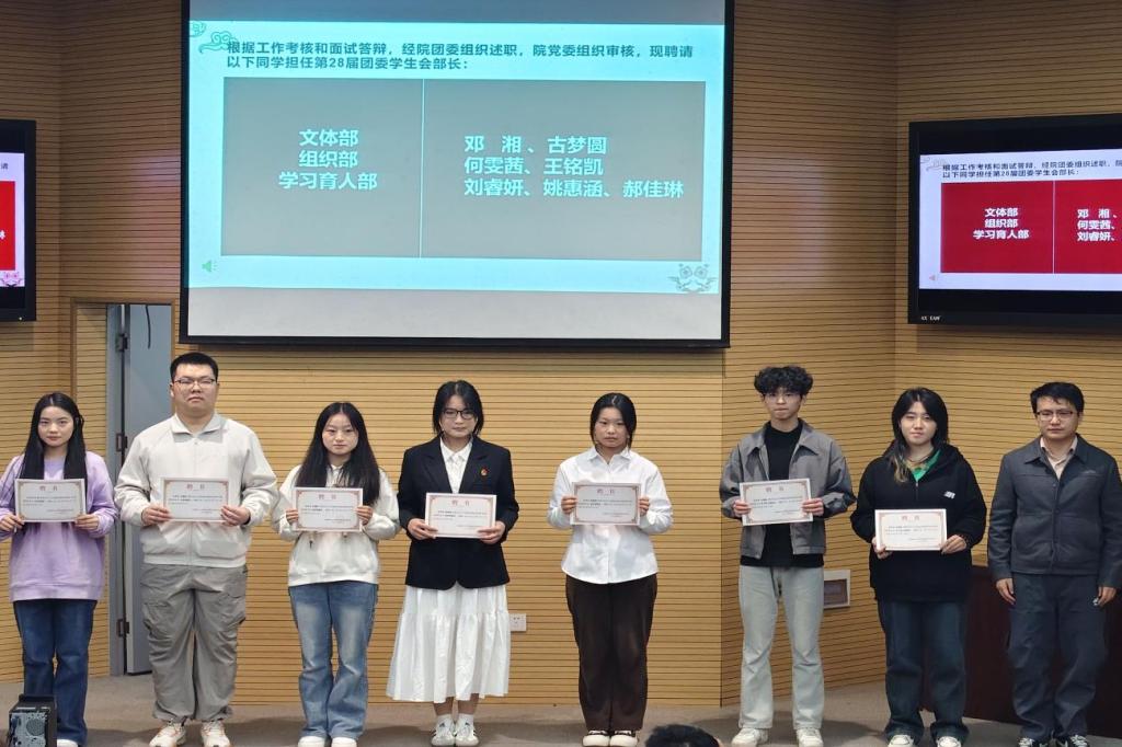黄仙,张颖旭,卜文琼为学生会主席,部长颁发聘请证书,鲜红的证书既是对学生干部责任的赋予,也是对他们服务同学、锤炼自我的期许。