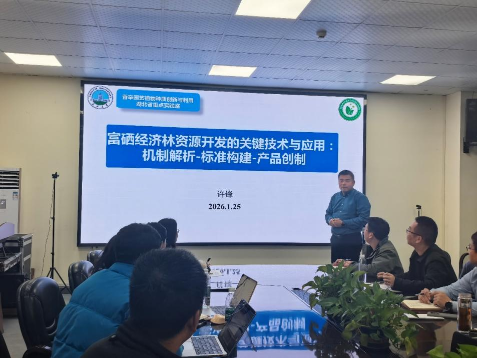 许锋教授作了题为《富硒经济林资源开发的关键技术与应用:机制解析–标准构建–产品创制》的专题报告,系统阐述了富硒经济林资源开发的全链条技术体系。报告聚焦硒代谢机制、田间标准化应用及高值产品创制三大核心,解析了经济林树种的聚硒特性与调控途径,贯通“机制—标准—产品”闭环,为硒健康产业与农林资源高值化提供了关键技术支撑。